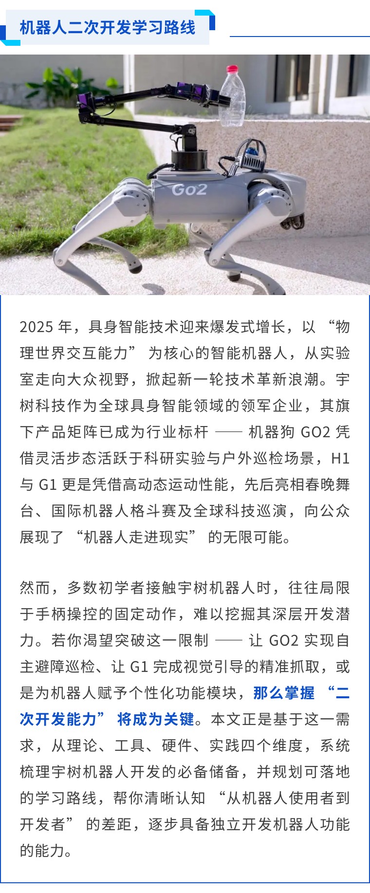 宇树机器人开发是 “理论 + 工具 + 实践” 的结合,降低了开发的门槛,新手无需畏惧,可按 “先仿真后硬件、先简单后复杂” 的节奏推进。关键是多动手(哪怕是简单的电机控制)、多排查问题(如 ROS 通信失败、传感器无数据),积累实战经验。随着技术储备的提升,你会逐步实现从 “操控机器人” 到 “开发机器人新功能” 的跨越,在具身智能浪潮中占据先机。
