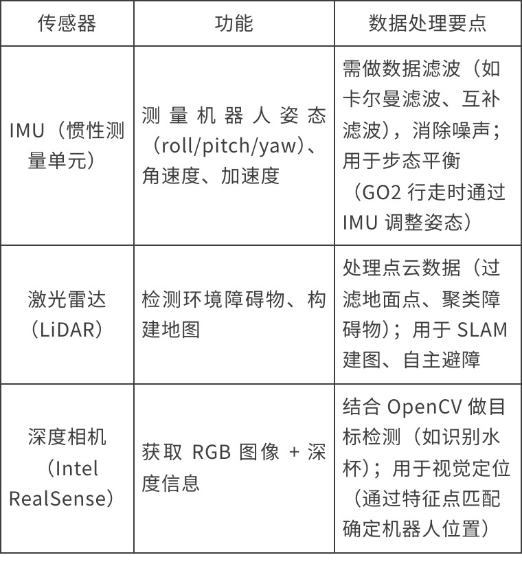 宇树机器人标配 / 可选传感器需掌握 “数据类型 + 处理逻辑”: