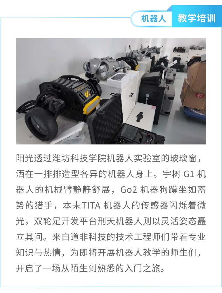 此次道非科技走进潍坊科技学院的机器人培训,以 “实操讲解 + 资源支撑” 为核心,实现了从 “知识传递” 到 “能力落地” 的闭环。在机器人讲解层面,工程师针对宇树 G1、Go2 机器狗、TITA 与刑天双轮足机器人,既覆盖了基础操控、保养维护的实用技巧,又锚定二次开发痛点,以厂商官网 SDK 文档为核心指引,让技术学习有章可循;在配套支持层面,定制化入门视频的补充,解决了师生 “课后复习无依据” 的难题,进一步降低了学习门槛。